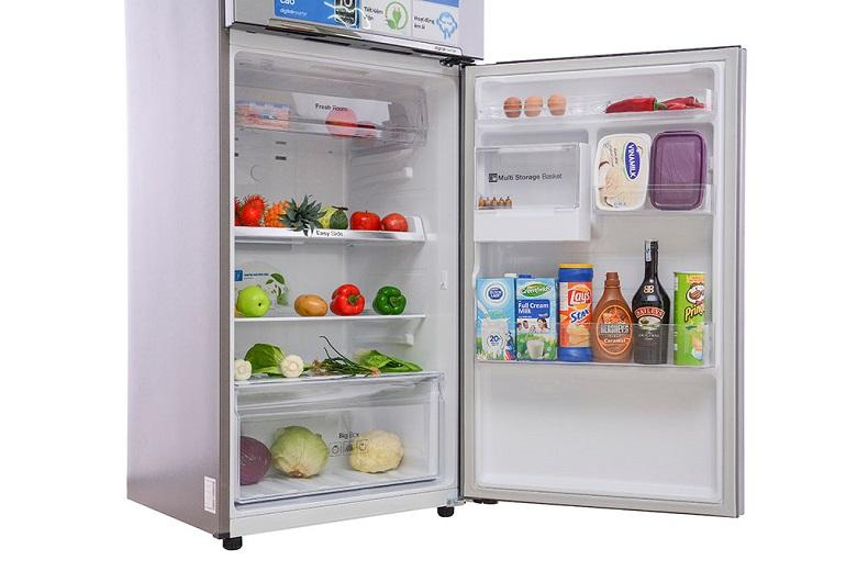 Tủ lạnh sử dung khay kính chịu lực có thể chứa được thực phẩm nặng ký mà không lo bị nứt vỡ (có thể lên đến 100 kg). Ngoài ra, khay chứa bên hông cửa tủ cũng có thể trượt linh hoạt giúp bạn thoải mái hơn trong việc lấy và xắp xếp thực phẩm