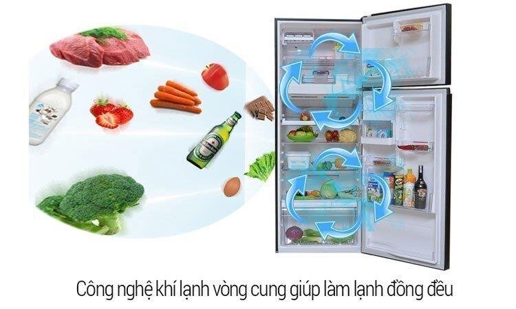 Tủ lạnh Toshiba GR-M28VUBZ(UK) 226 lít đen luồng khí lạnh vòng cung làm lạnh nhanh, tỏa đều nhanh chóng khắp các ngăn tủ giúp duy trì nhiệt độ làm lạnh tối ưu bảo quản thực phẩm an toàn, xanh tươi sử dụng được thời gian lâu hơn.