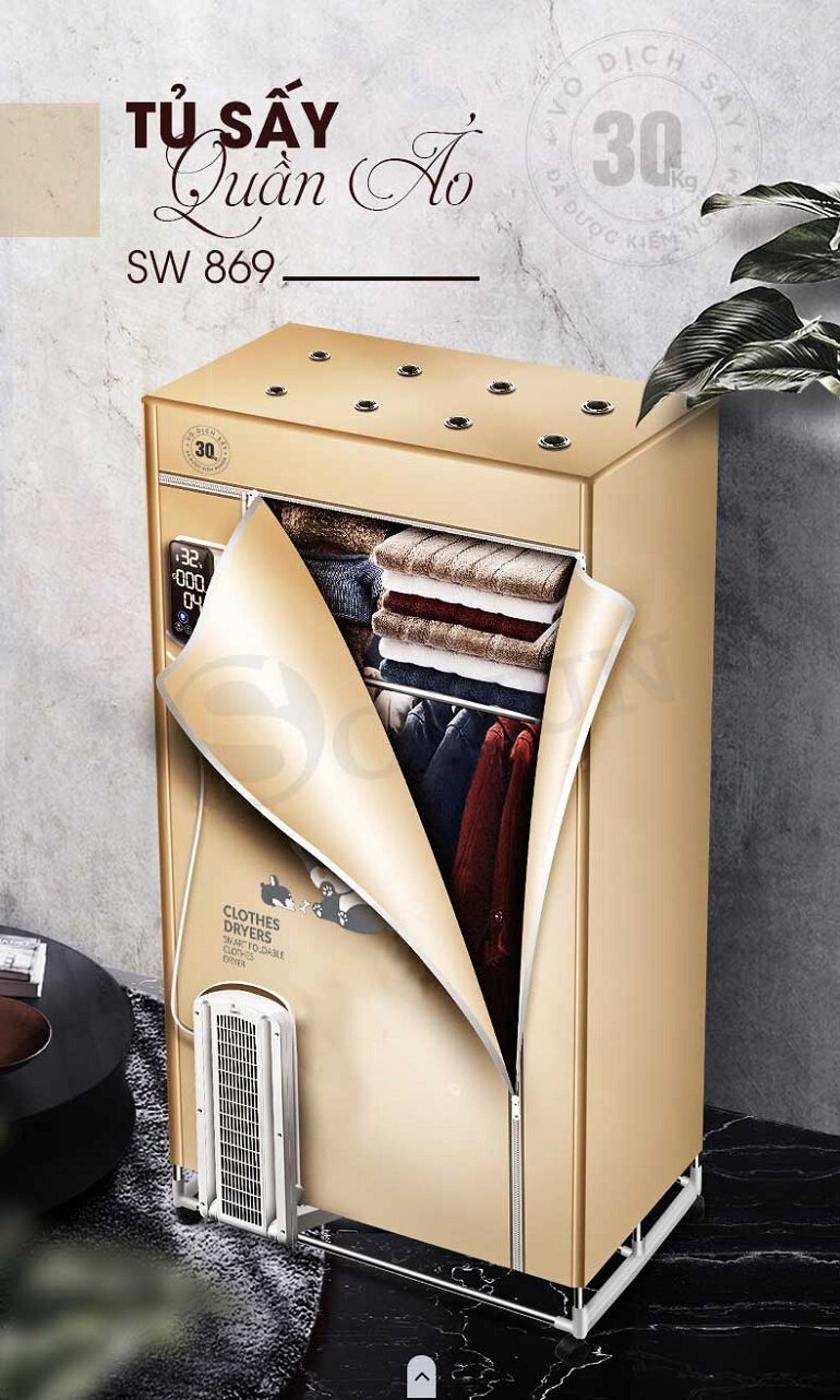 Nhiều tùy chọn sấy (bật/tắt, nhanh/chậm, sấy ion, sấy tự động, hẹn giờ, v.v.) có sẵn trong tủ. SW 869 có nhiều công dụng, một trong số đó là dùng để sấy khô quần áo. sưởi ấm căn phòng hoặc biến thành tủ quần áo và giá phơi quần áo thiết thực.