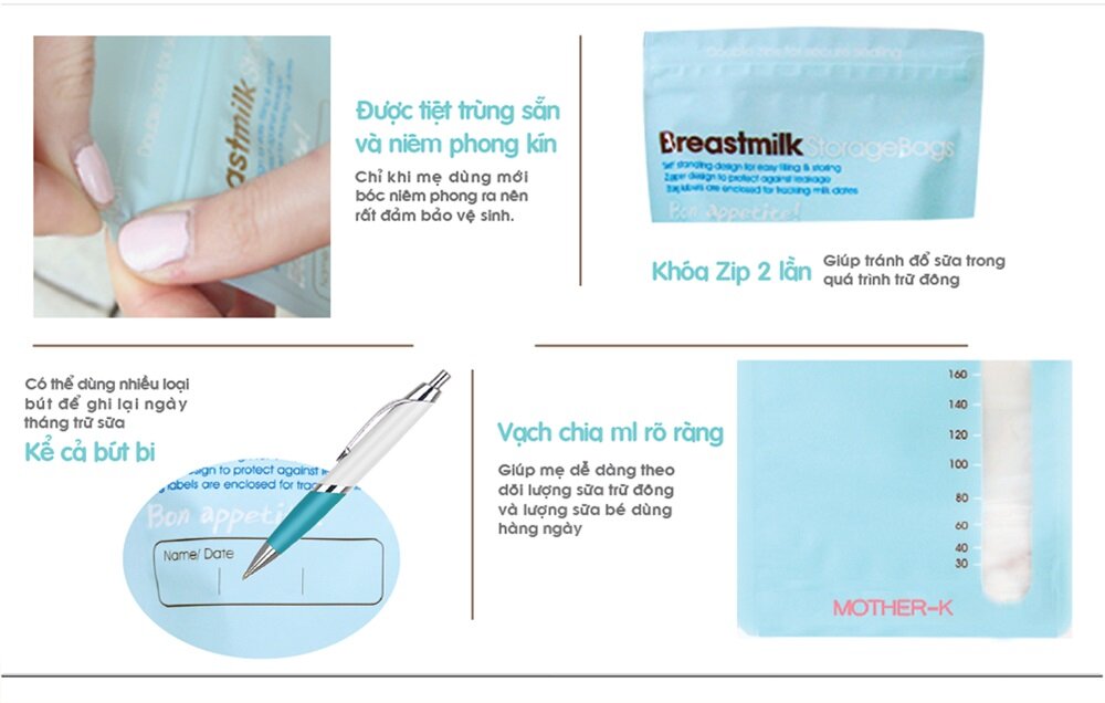 - Để có được môi trường chứa sữa vô trùng 100%, túi trữ sữa Mother-K đã được tiệt trùng sẵn và niêm phong kín, đảm bảo túi không bị mở ra trước khi sử dụng.- Túi trữ sữa Mother-K được thiết kế với 2 lần khóa zip, kèm theo đó là hai đường cắt nằm ở trên và dưới khóa zip nhằm tránh rò rỉ sữa trong quá trình trữ đông và tiện lợi mỗi khi sử dụng.