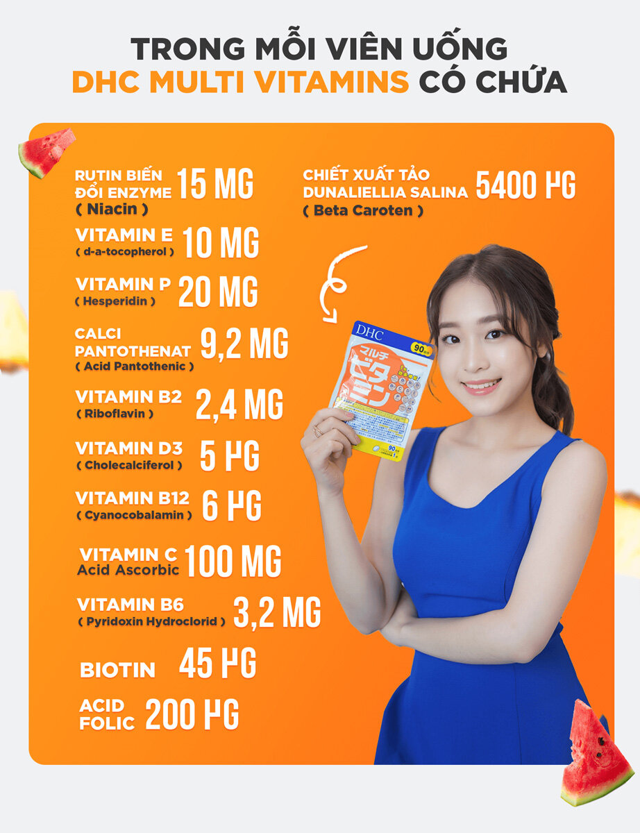 Trong mỗi viên uống DHC Multi Vitamin có chứa đến 12 loại Vitamin thiết yếu cho cơ thể: β-carotene, B1, B2, B6, B12, C, D, E, Niacin, acid panthonenate, acid folic, Biotin. Các thành phần được phối trộn với tỷ lệ cân bằng và hợp lý nhất, đặc biệt tốt đối với người hay bị mất cân bằng dinh dưỡng, người ăn ít, người bận rộn. Khi vào trong cơ thể, các Vitamin này sẽ tham gia vào quá trình chuyển hóa để giúp cơ thể phát triển toàn diện & lành mạnh, duy trì sức khoẻ, đảm bảo cho cơ thể hoạt động dẻo dai, quên đi những mệt mỏi, căng thẳng.