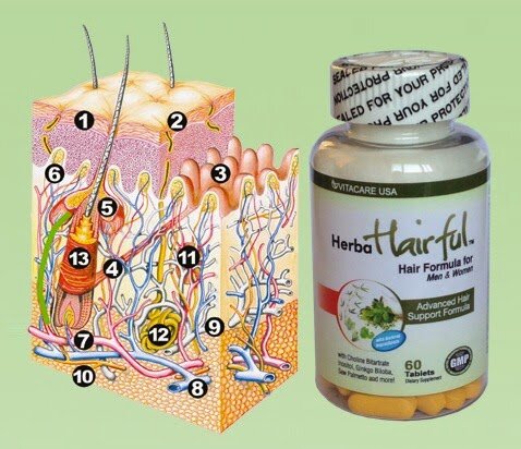 Viên uống trị rụng tóc VitaCare USA Herba Hairful có tác dụng làm chậm và ngừng rụng tóc, hỗ trợ điều trị rụng tóc cho cả nam và nữ, thúc đẩy lưu thông máu đến da đầu làm cho da đầu và tóc khỏe mạnh, bảo vệ chân tóc, giảm gãy rụng, khôi phục lại tóc đã mất.