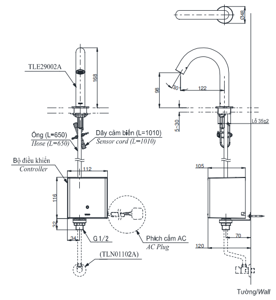 Bản vẽ kỹ thuật vòi TOTO cảm ứng tự động (Loại gắn bàn) - TLE29002A