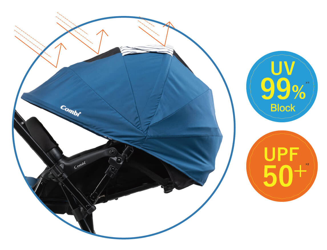 8. Màn chụp đa nấc ở xe đẩy Combi Neyo Plus Air chống nắng, che mưa, ngăn bụi: