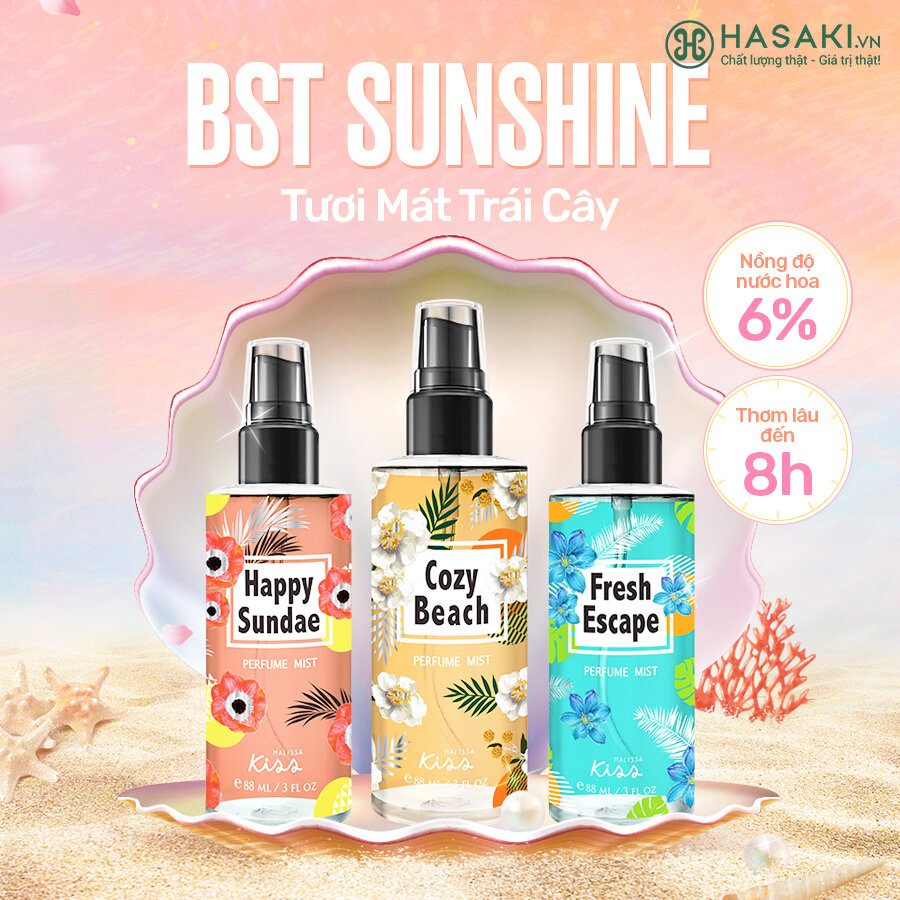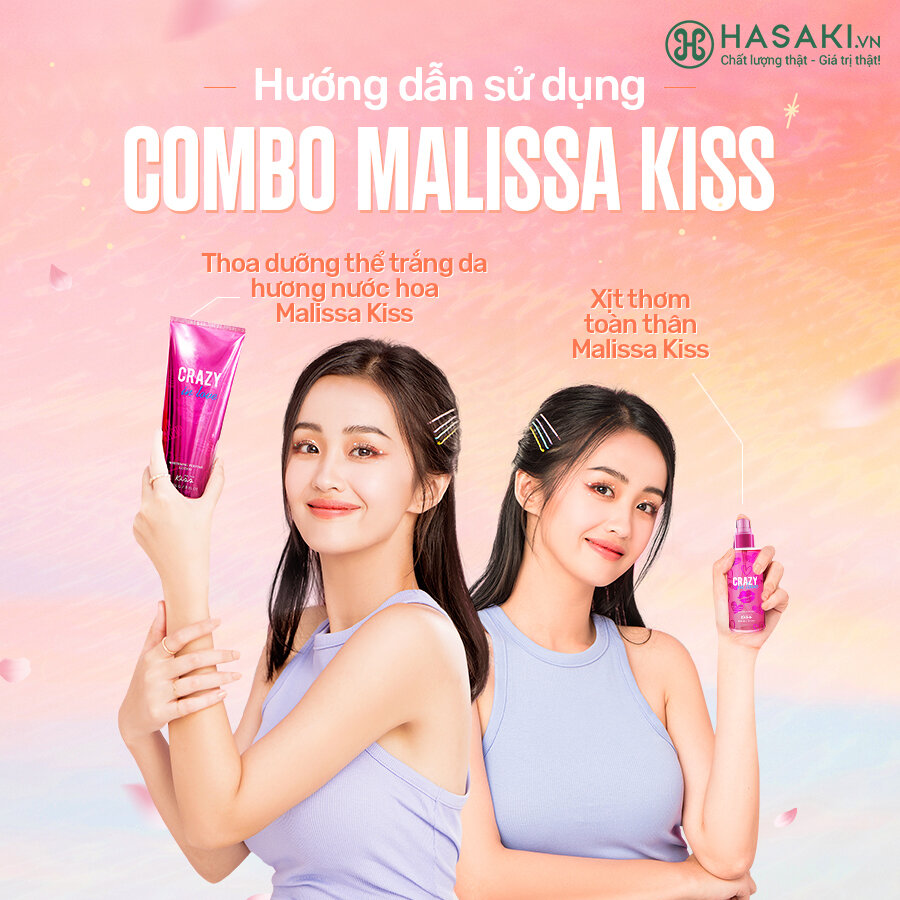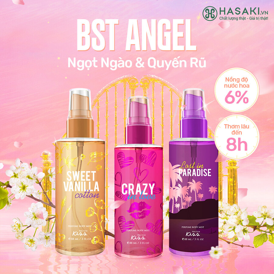 Xịt thơm toàn thân Malissa Kiss được tạo ra với công thức độc quyền từ phòng thí nghiệm tại Thái Lan. Hiện sản phẩm Xịt Thơm Toàn Thân Malissa Kiss Perfume Body Mist 88ml đã có mặt tại Hasaki với 6 mùi hương được chia ra 2 BST chính: